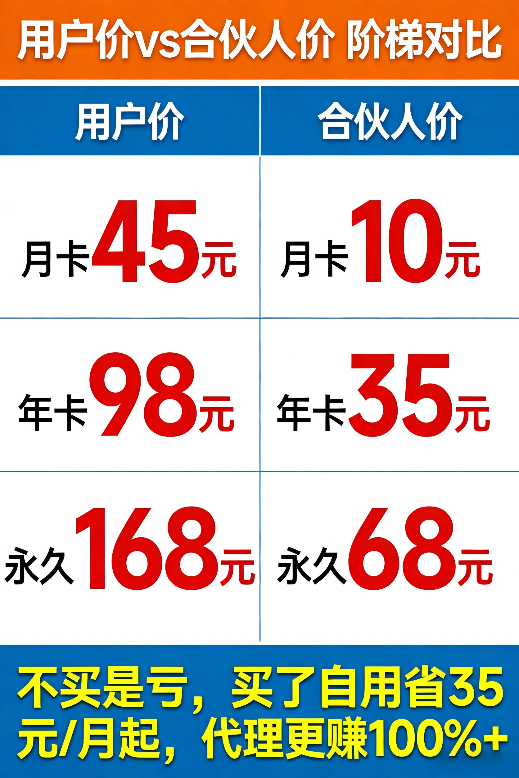 • 极致利差: 我们的月卡合伙人拿货价仅需 10 元,你卖给终端用户 45 元,一单净赚 35 元